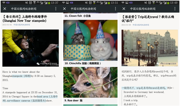 在Chinadaily_mobile,时常出现一些热点新闻,比如:上海跨年踩踏事件(Shanghai New Year stampede),在了解新闻的同时也能掌握地道的英文报道。不仅如此,有时还会盘点一些有趣的事情,比如:全球最萌的20种动物(20 most adorable animals),通过可爱的动物来增加我们阅读的积极性。更多的时候,它带来的是有趣的知识,例如:教我们正确说旅行(Trip or travel)