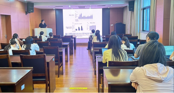 讲座伊始,张群卫教授指出PM是一种存在于空气中的固液混合物,包括有机化合物、无机化合物、烟尘、金属和灰尘颗粒等。这些微粒可随呼吸进入肺部深处,尤其PM2.5能穿透肺泡并被巨噬细胞吞噬。在高糖环境下,肺泡巨噬细胞的代谢状态发生改变,导致NLRP3炎症小体异常激活,进而促进IL-1β和IL-18的释放,引发慢性低度炎症。张教授通过体外细胞实验验证了该机制,并发现高血糖显著增强PM2.5诱导的氧化应激,从而加剧炎症反应。这一发现为糖尿病患者受空气污染危害的易感性提供了分子机制解释。互动环节中,针对高糖环境和PM2.5在激活NLRP3时的共同作用方式等问题,张群卫教授也都一一详细给出了解答。本次的学术交流让在座的师生们对糖尿病患者对空气污染易感性的最新研究成果有了深入的了解,为今后的课题研究提供了新的思路和方向。