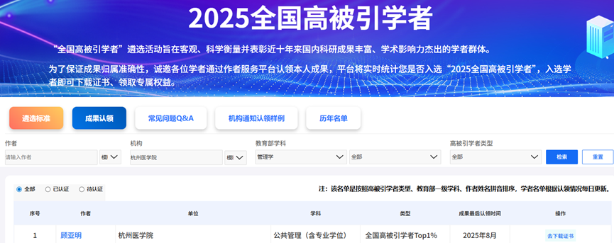 近日,中国知网(CNKI)发布了2025年“全国高被引学者”名单。我院共有4位教师在公共管理(含专业学位)领域入选,其中顾亚明老师入选该领域“TOP1%”学者,陈定湾、高启胜、胡慧美老师入选“TOP5%”学者。