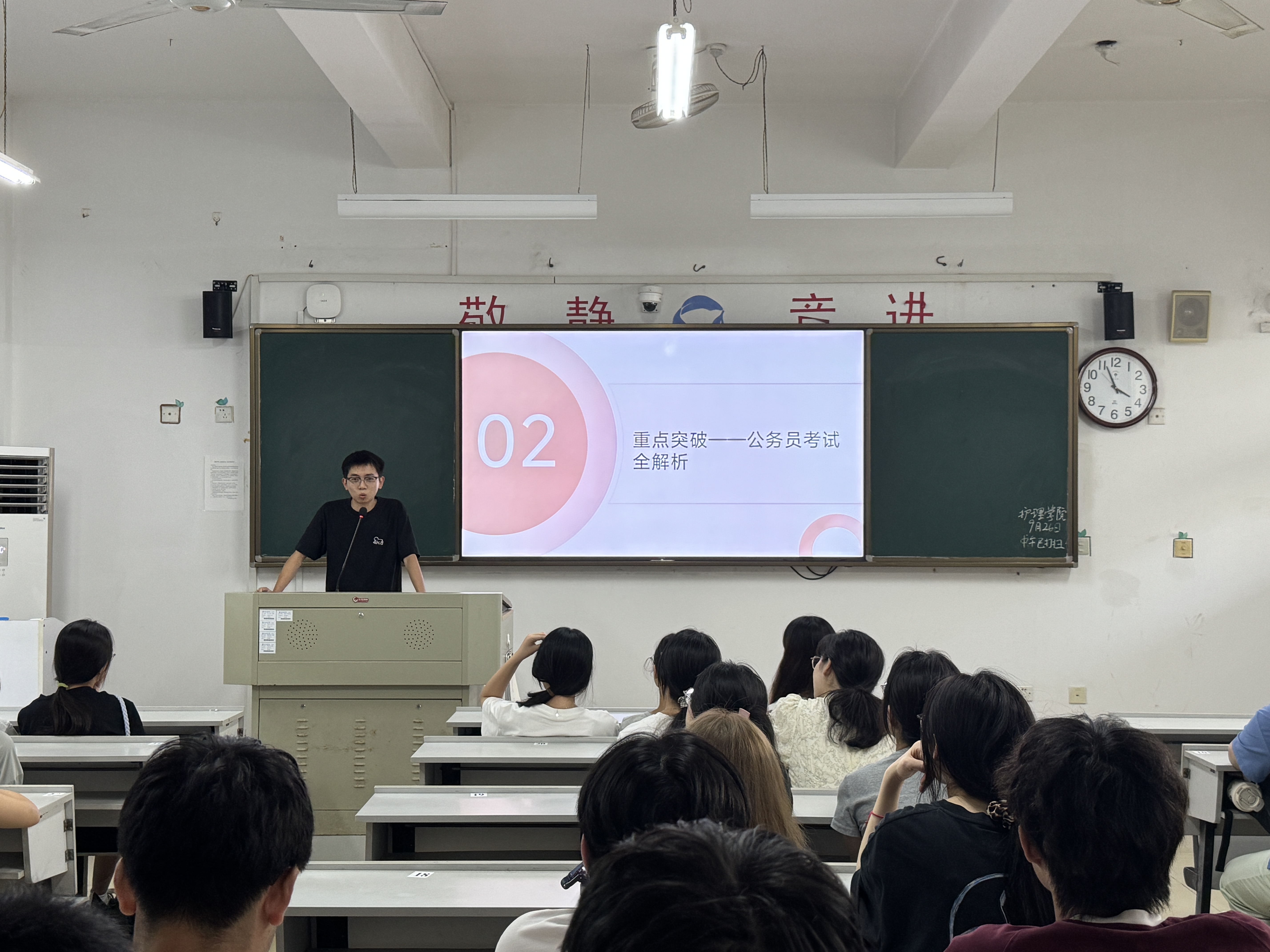 任东来学长在 2025 年公务员考试中表现优异,不仅参与了国考与省考,还凭借扎实的备考功底成功上岸海关,具备丰富的实战经验与备考思路。分享会上,他以 “职业规划分享:我的备考之路与思考” 为主题,结合自身备考经历,从 “重点突破” 与 “公务员考试全解析” 两大核心板块展开讲解。